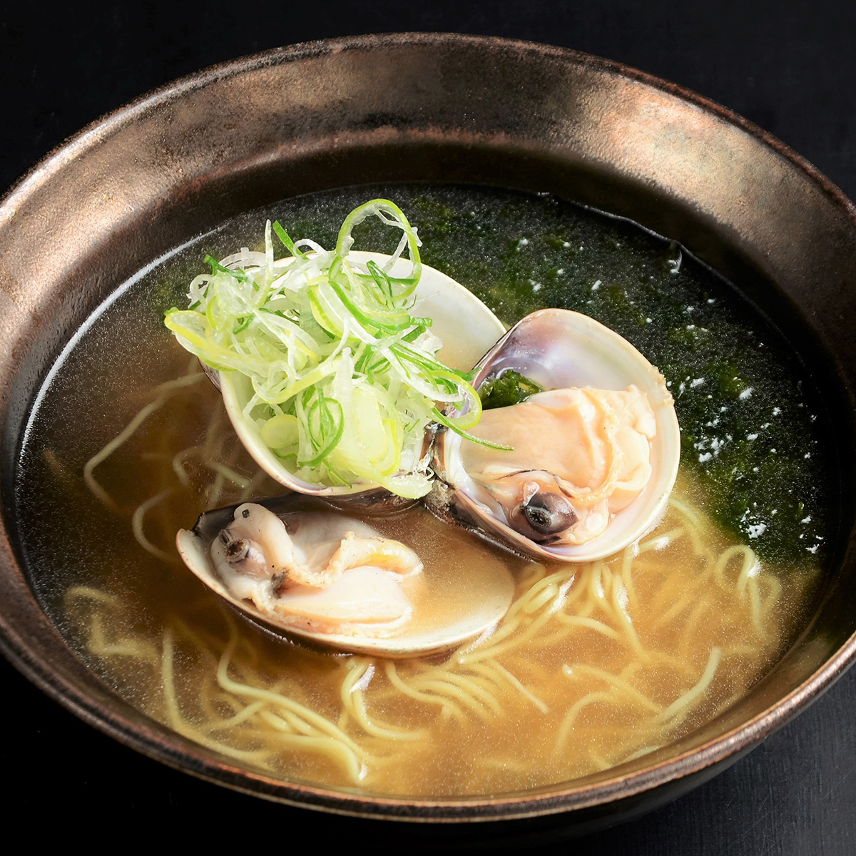 【スープ】ハマグリエキス、発酵調味料、食塩、醤油、ホタテエキス、コンブエキス、砂糖、魚醤、畜肉エキス(ポーク、チキン)?、植物油脂、動物油脂、玉葱エキス、にんにく、生姜、酵母エキス/調味料(アミノ酸等)、(一部に小麦・大豆・豚肉・鶏肉・魚醤(魚介類)を含む)